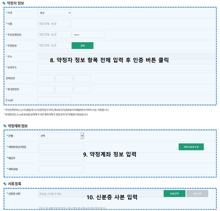 - 지역, 성명, 주민등록번호 등 개인정보 입력합니다. 신청자와 예금주명은 동일해야 합니다.