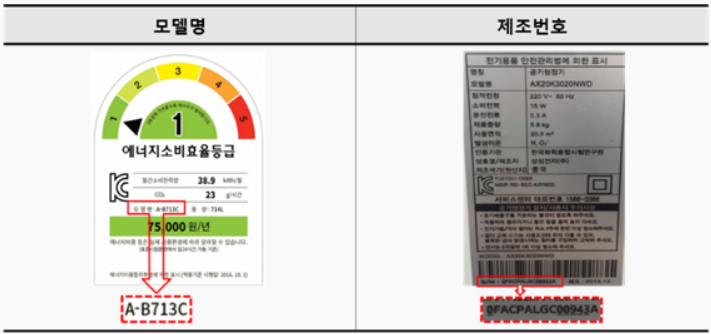모델명은 에너지소비효율등급 라벨을 통해, 제조번호(시리얼번호, Serial NO, S/N, 일련번호)는 명판사진을 통해 확인할 수 있습니다.