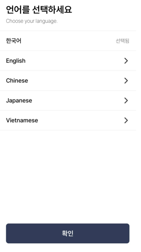 2. 앱을 설치하면 '모바일 건강보험증' 앱에서 아래와 같이 화면에서 '개인입니까?'를 확인 후, 언어를 한국어로 선택하세요.